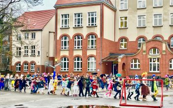 Unsere Karnevalssitzung startete heute wie immer mit einer großen Polonaise über den Schulhof. Gemeinsam zogen Kinder, Lehrer*innen, Eltern und Ehemalige gut gelaunt und kostümiert in die Turnhalle.
