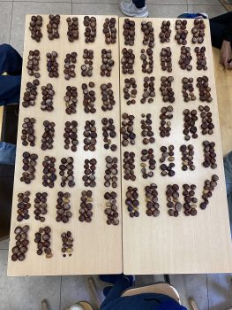 Die Drittklässler haben sich mit dem Tausenderraum auseinandergesetzt und viele Kastanien gezählt. Für die Viertklässler ging es in den Millionenraum mit sehr vielen Kronkorken.